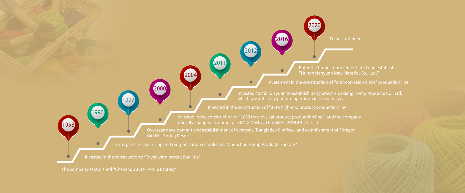 Xiang Nan Jute &Sisal Products Ltd. is located at No. 166 Nanling Avenue, Chenzhou City, Hunan, China, 2 kilometers away from the Chenzhou Freight Station of Beijing-Guangzhou Railway, and its headquarters covers an area of 180,000 square meters. The company has established or controlled Xiang Nan Jute &Sisal Products Ltd. andXiang Nan Jute &Sisal Products Ltd. 1200 existing shareholders and employees......