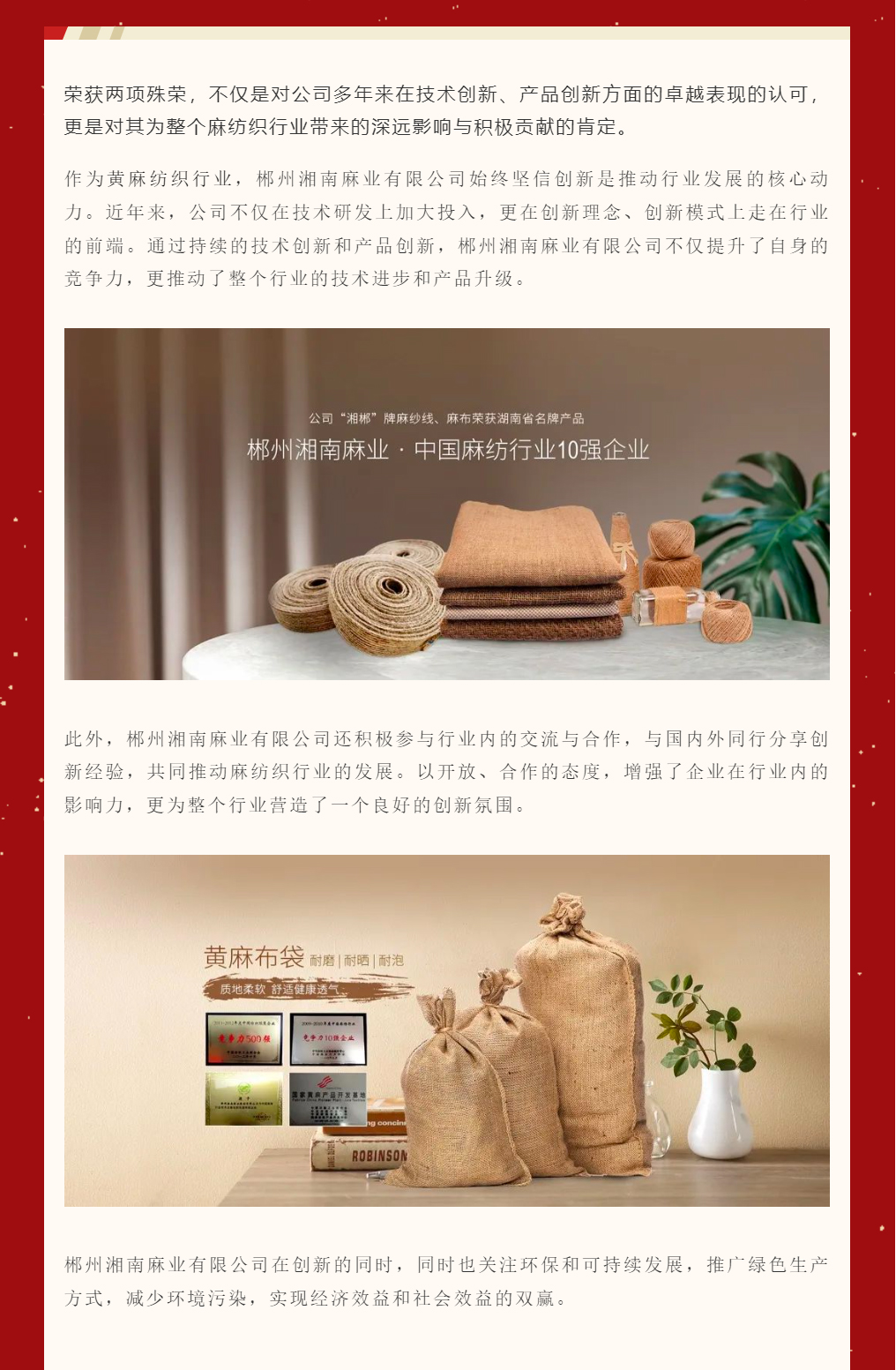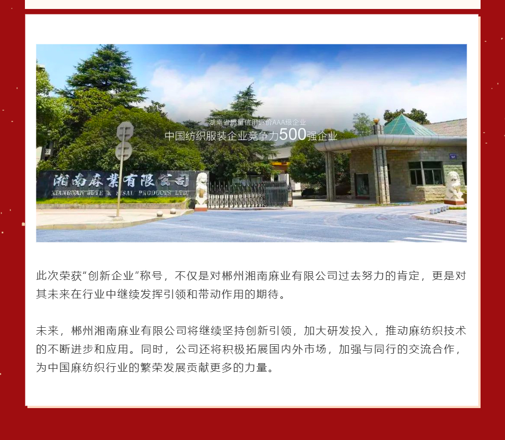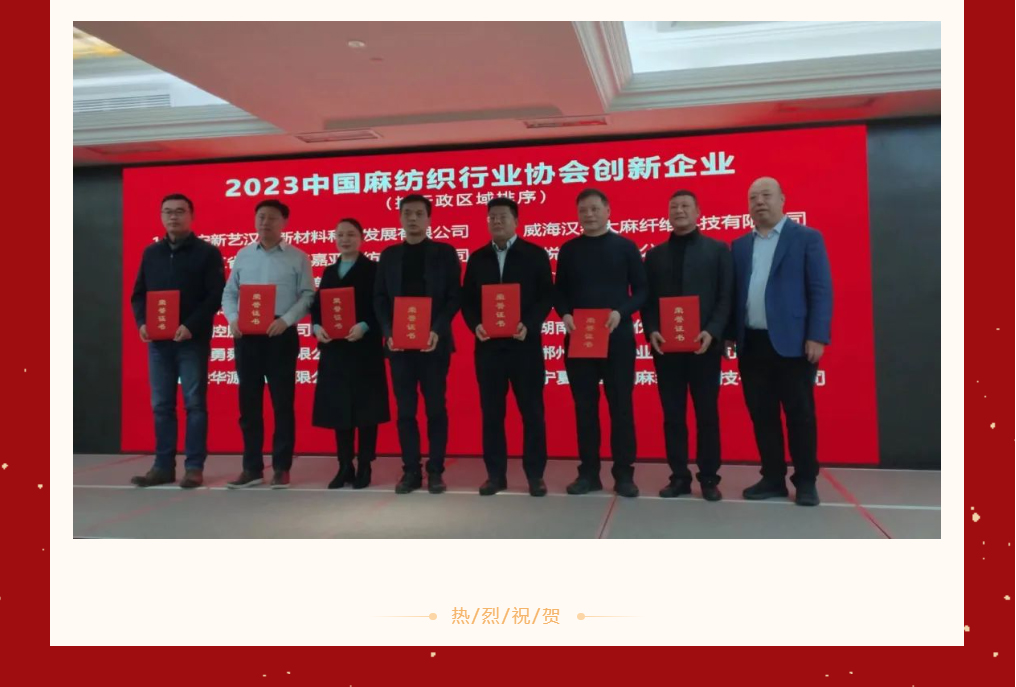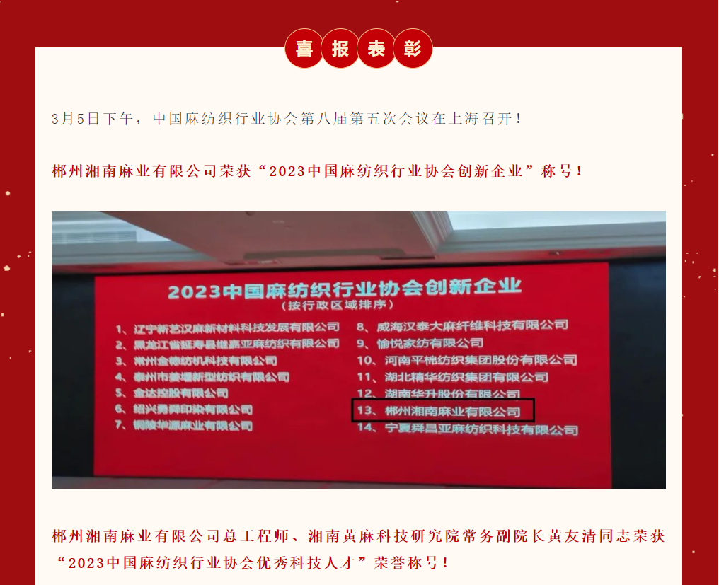 喜報|郴州湘南麻業(yè)有限公司榮獲2023中國麻紡織行業(yè)協會創(chuàng)新企業(yè)